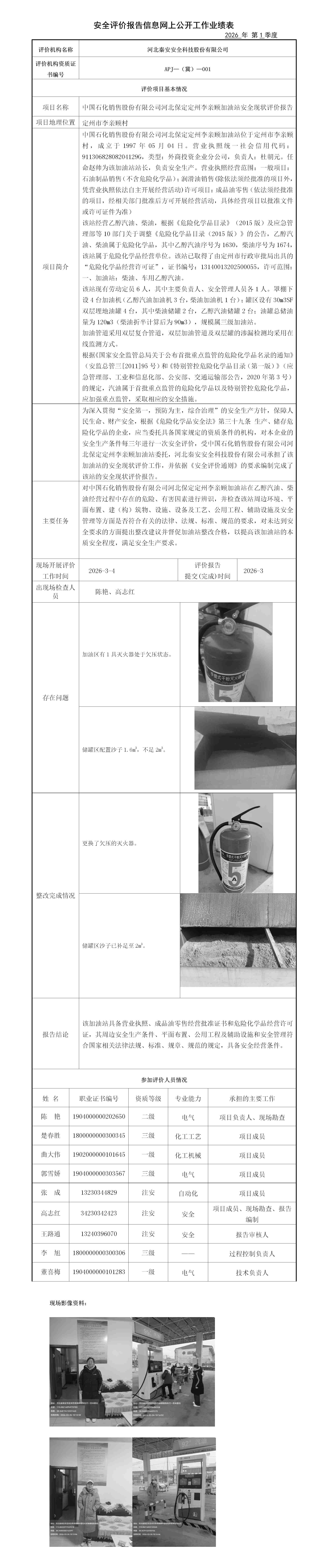 中国石化销售股份有限公司河北保定定州李亲顾加油站安全现状评价报告——信息网上公开工作业绩表