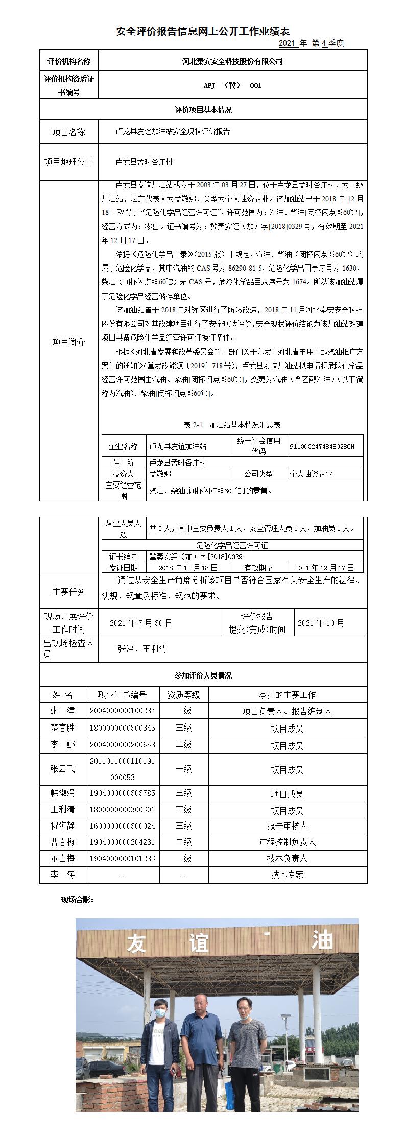 卢龙县友谊加油站安全现状评价报告——信息网上公开工作业绩表