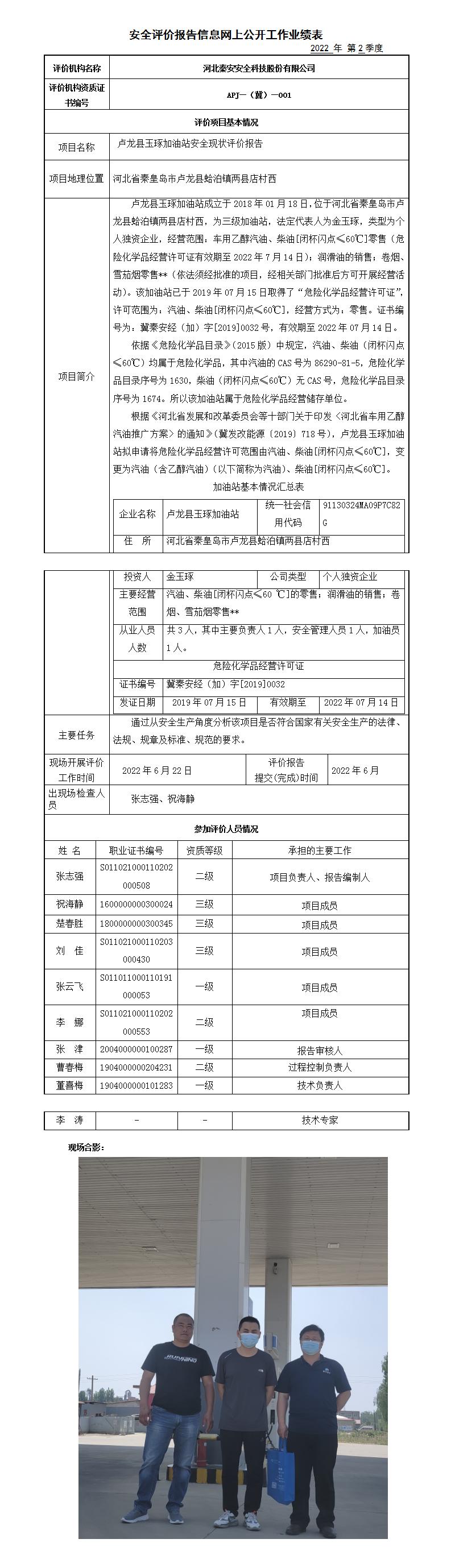昌黎聚丰化工产品有限公司经营危险化学品安全评价报告、卢龙县玉琢加油站安全现状评价报告——信息网上公开工作业绩表