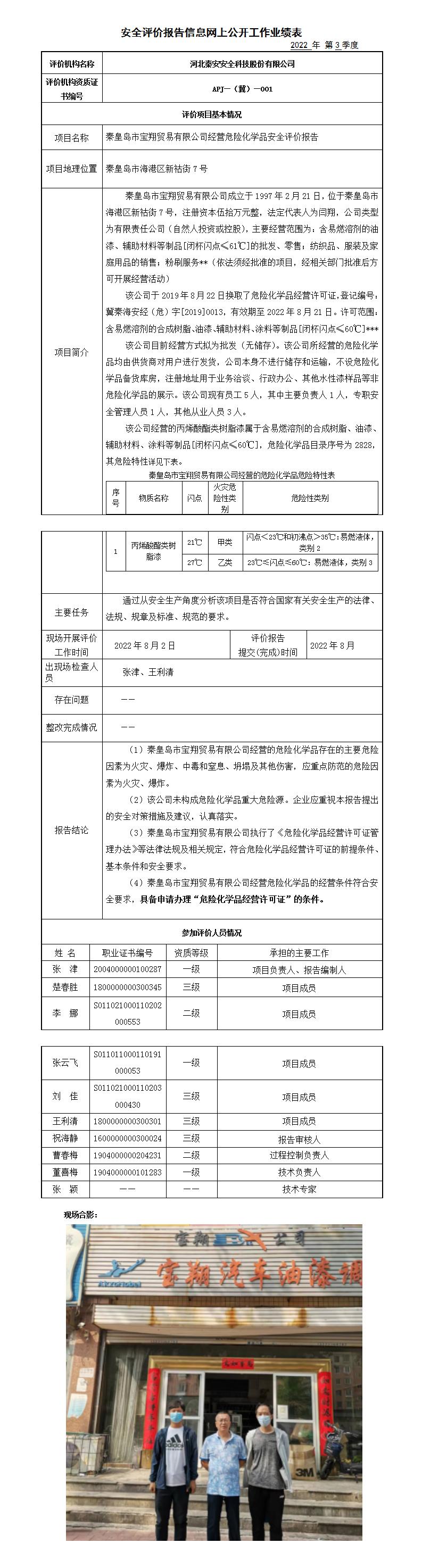 秦皇岛市宝翔贸易有限公司经营危险化学品安全评价报告——信息网上公开工作业绩表