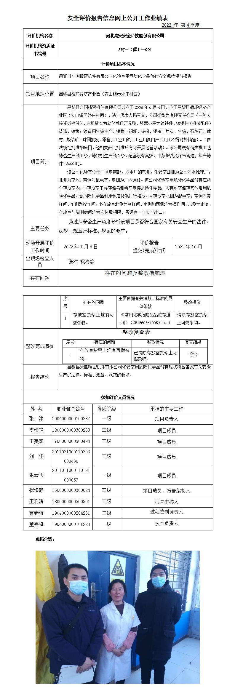 昌黎县兴国精密机件有限公司化验室用危险化学品储存安全现状评价报告——信息网上公开工作业绩表