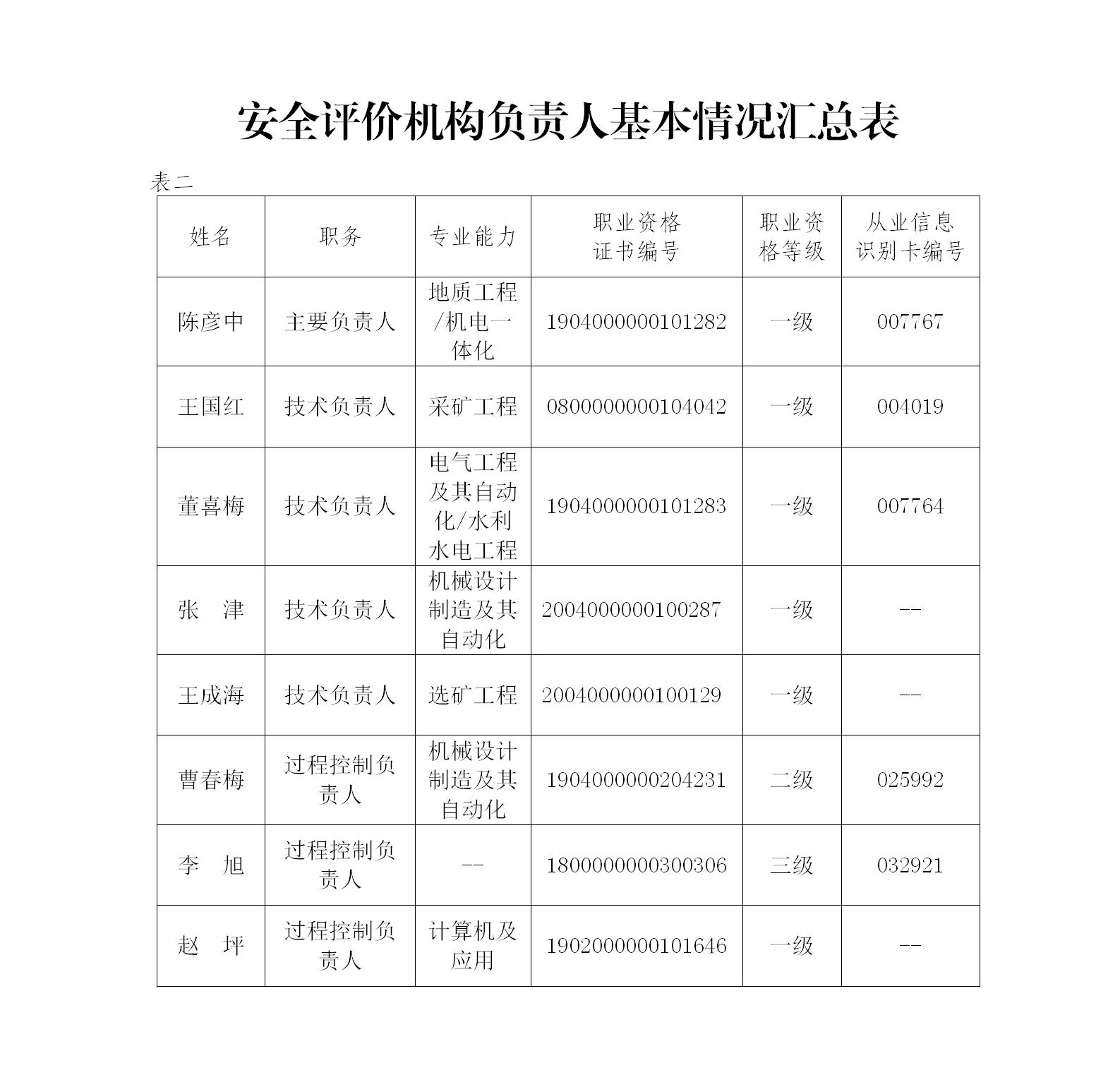 安全评价机构负责人、技术负责人和过程控制负责人汇总表2023