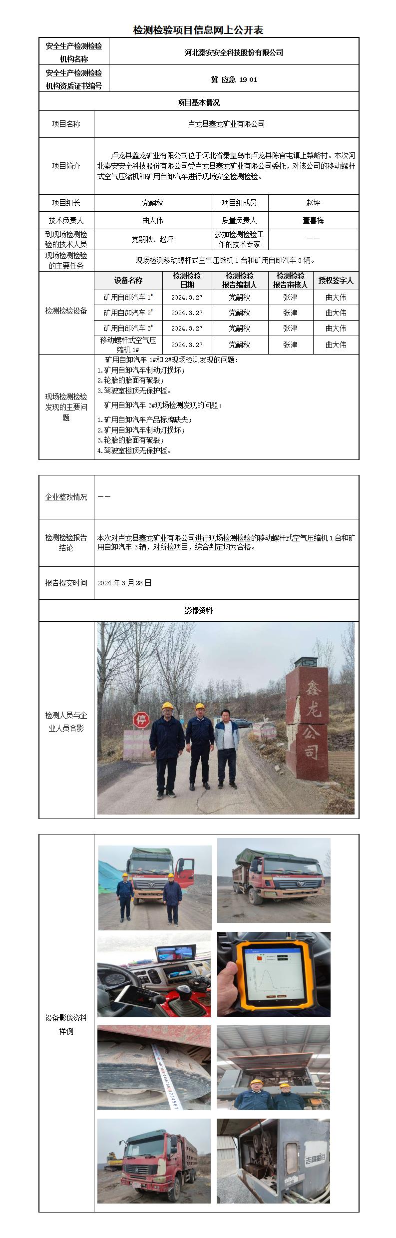 冀秦2024-0B20007卢龙县鑫龙矿业有限公司-----检测检验信息网上公开表