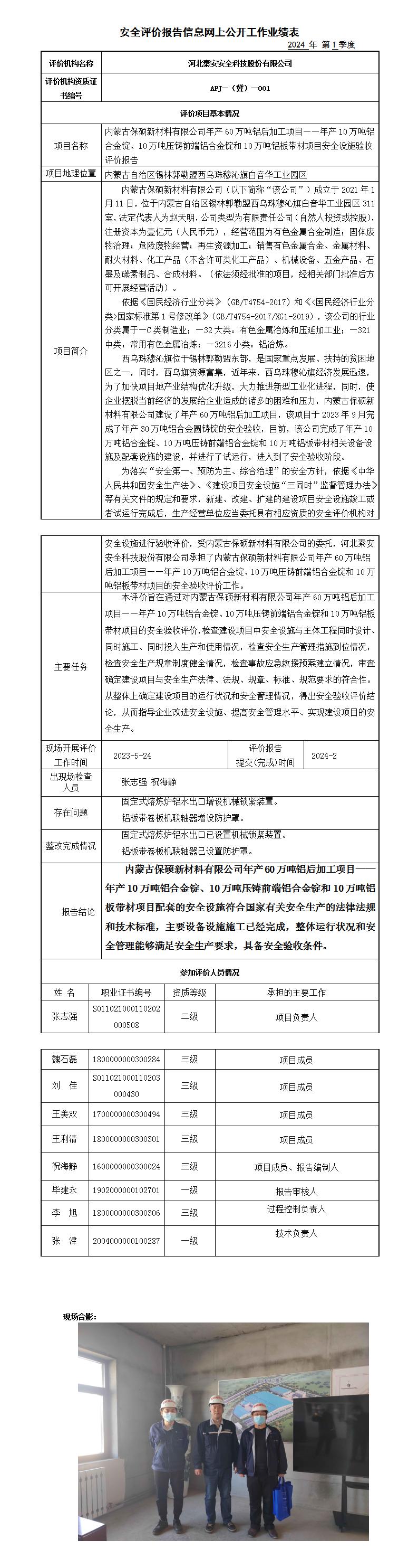 内蒙古保硕新材料有限公司年产60万吨铝后加工项目——年产10万吨铝合金锭、10万吨压铸前端铝合金锭和10万吨铝板带材项目安全设施验收评价报告——信息网上公开工作业绩表