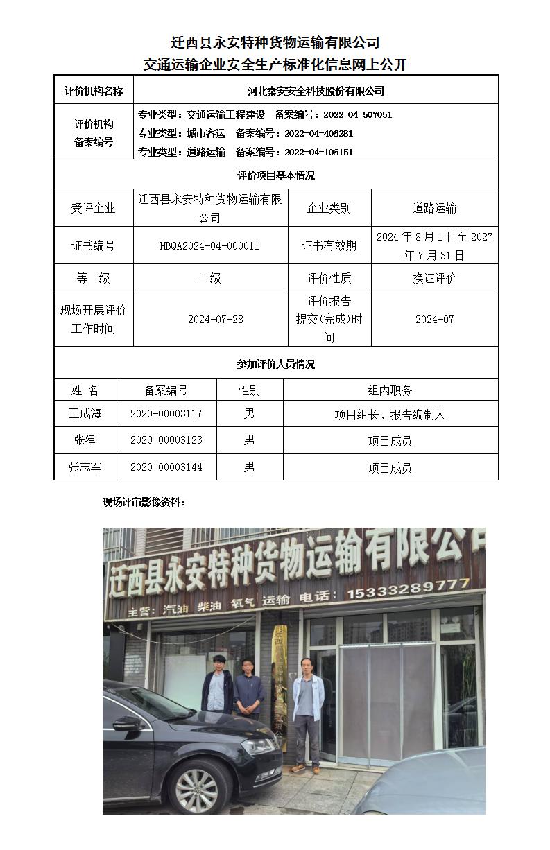 迁西县永安特种货物运输有限公司交通运输企业安全生产标准化信息网上公开