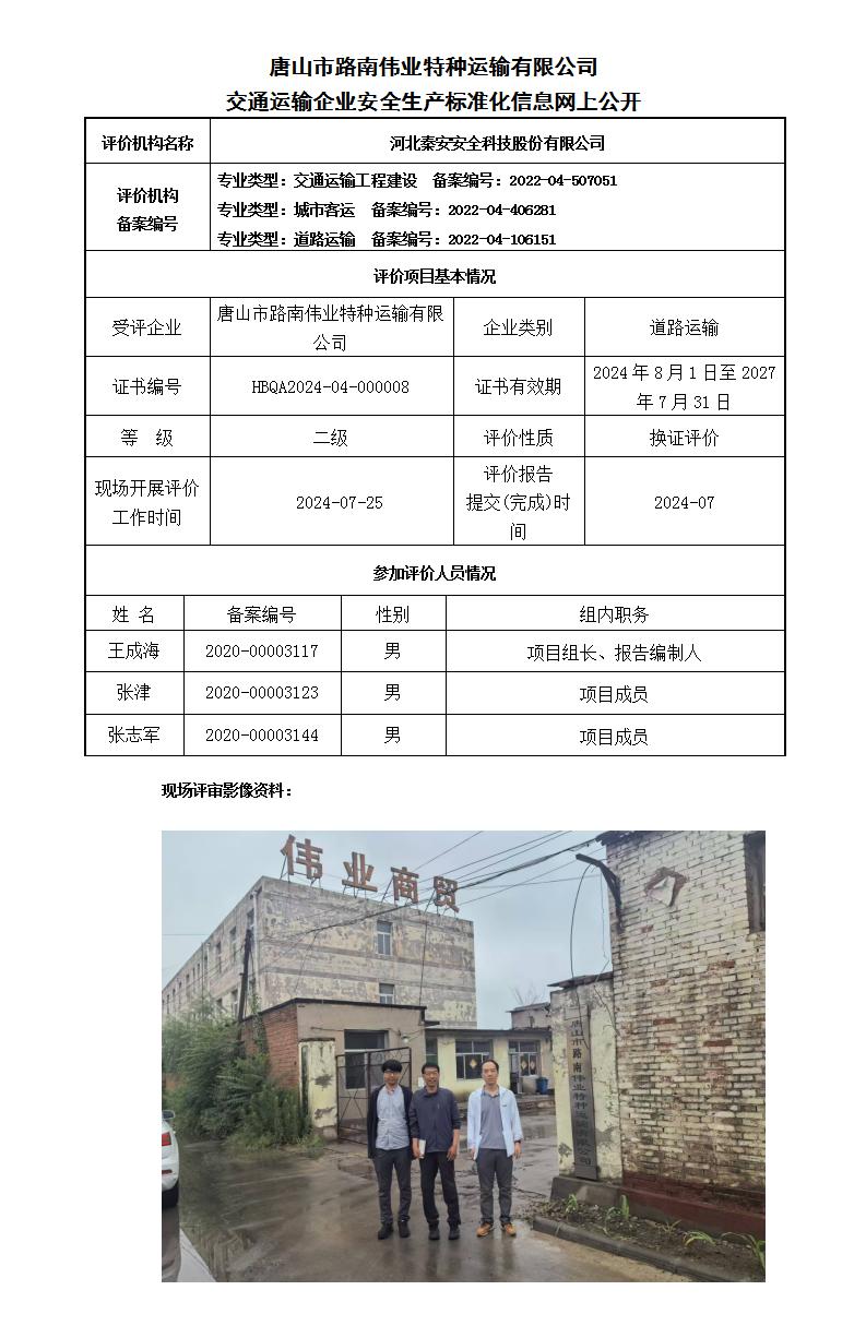 唐山市路南伟业特种运输有限公司交通运输企业安全生产标准化信息网上公开
