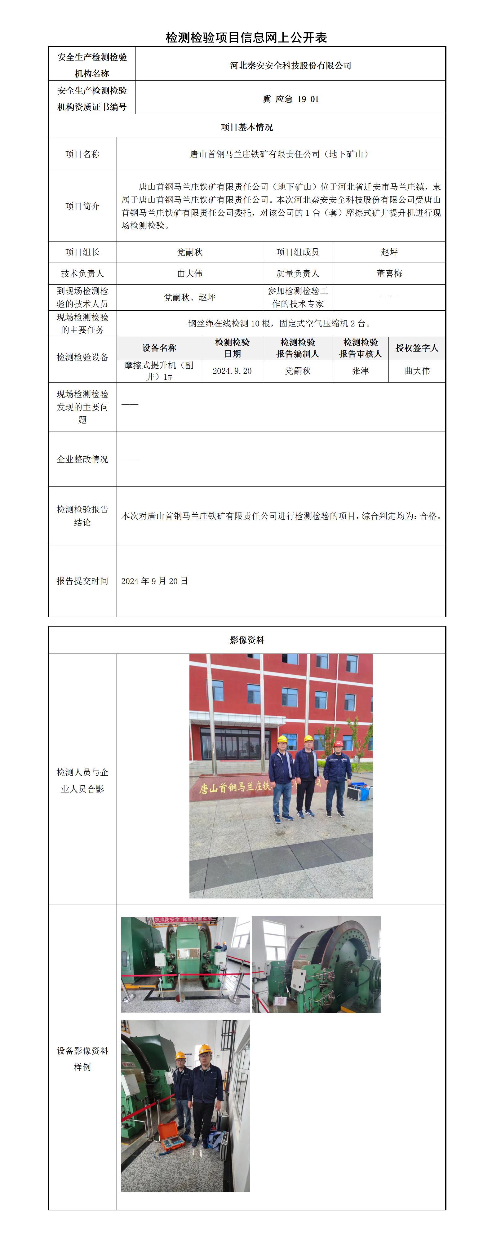 冀秦2024-0B20003唐山首钢马兰庄铁矿有限责任公司(地下矿山)-----检测检验信息网上公开表