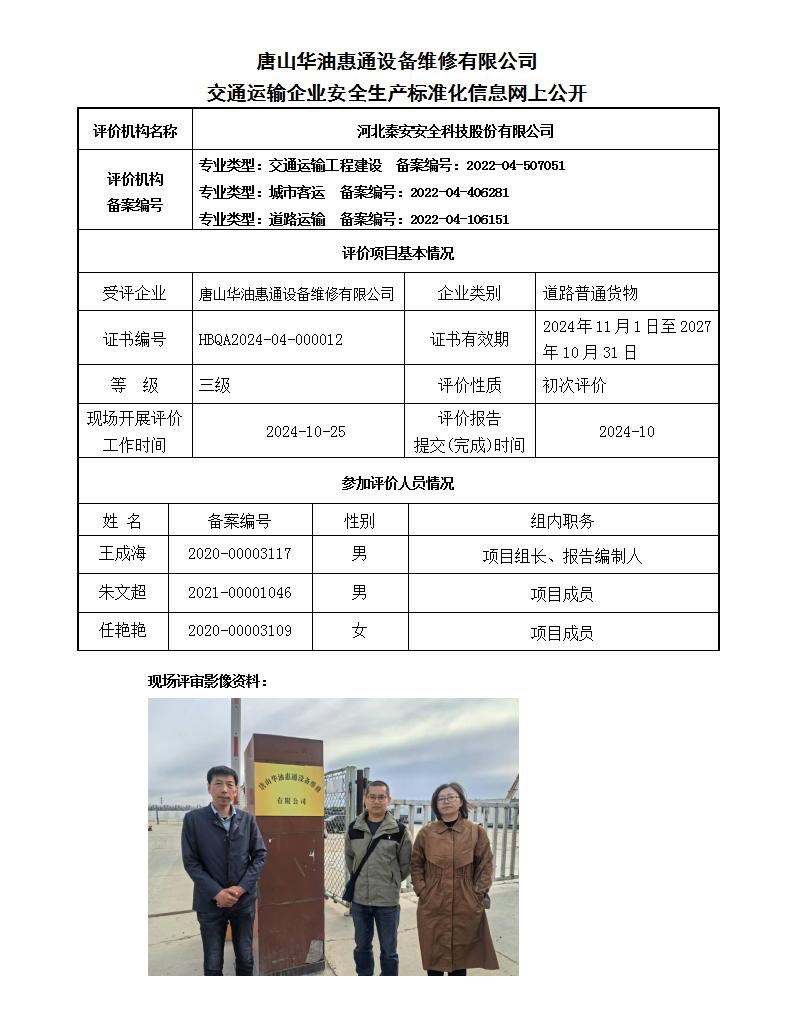 唐山华油惠通设备维修有限公司交通运输企业安全生产标准化信息网上公开