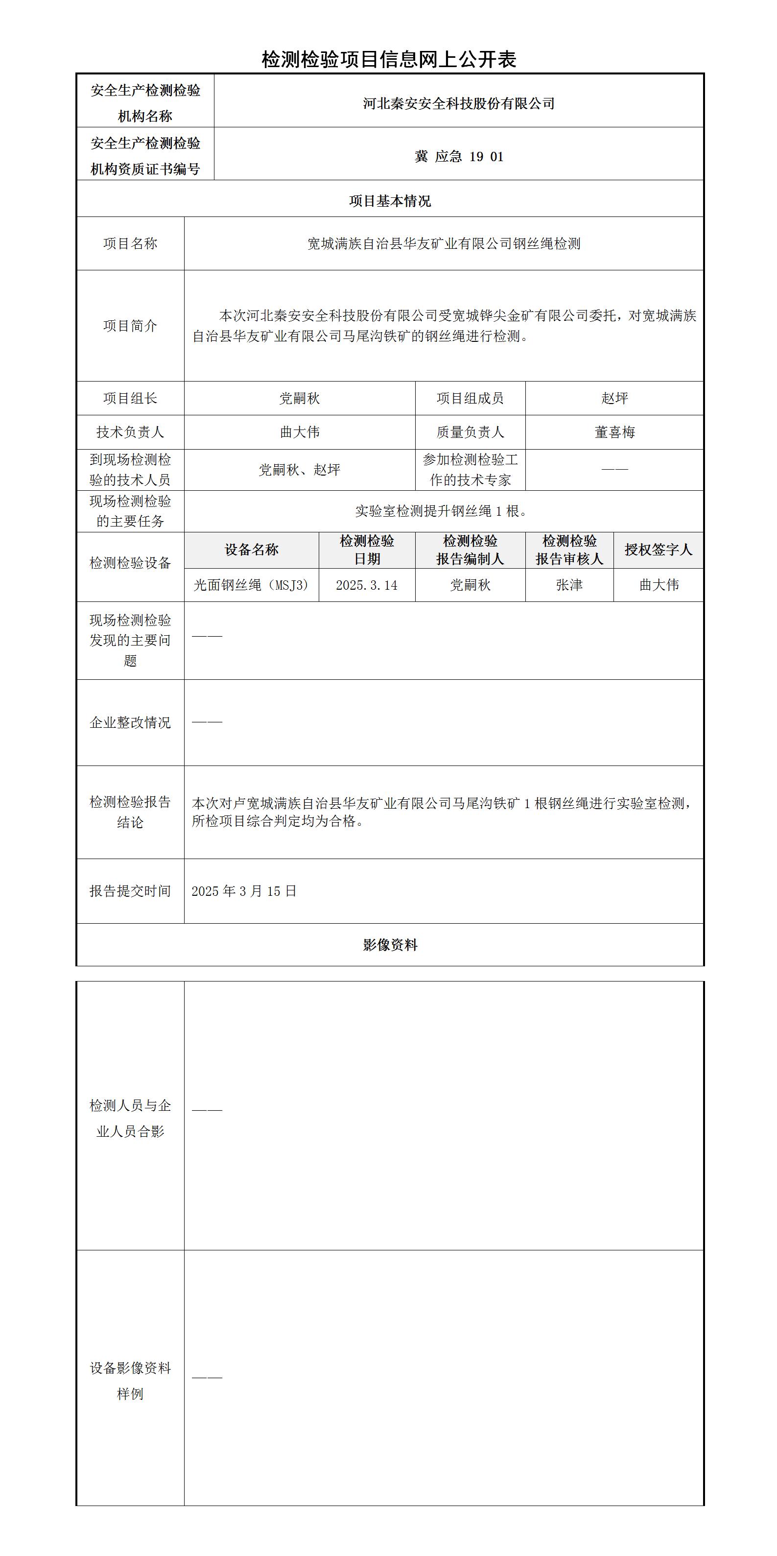 冀秦2025-0B20012 宽城满族自治县华友矿业有限公司马尾沟铁矿(地下矿山)-----检测检验信息网上公开表