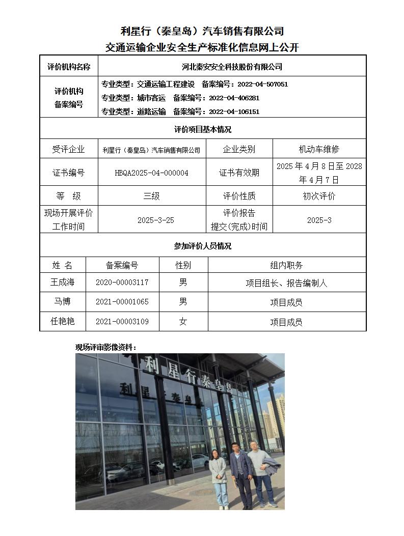 利星行(秦皇岛)汽车销售有限公司交通运输企业安全生产标准化信息网上公开