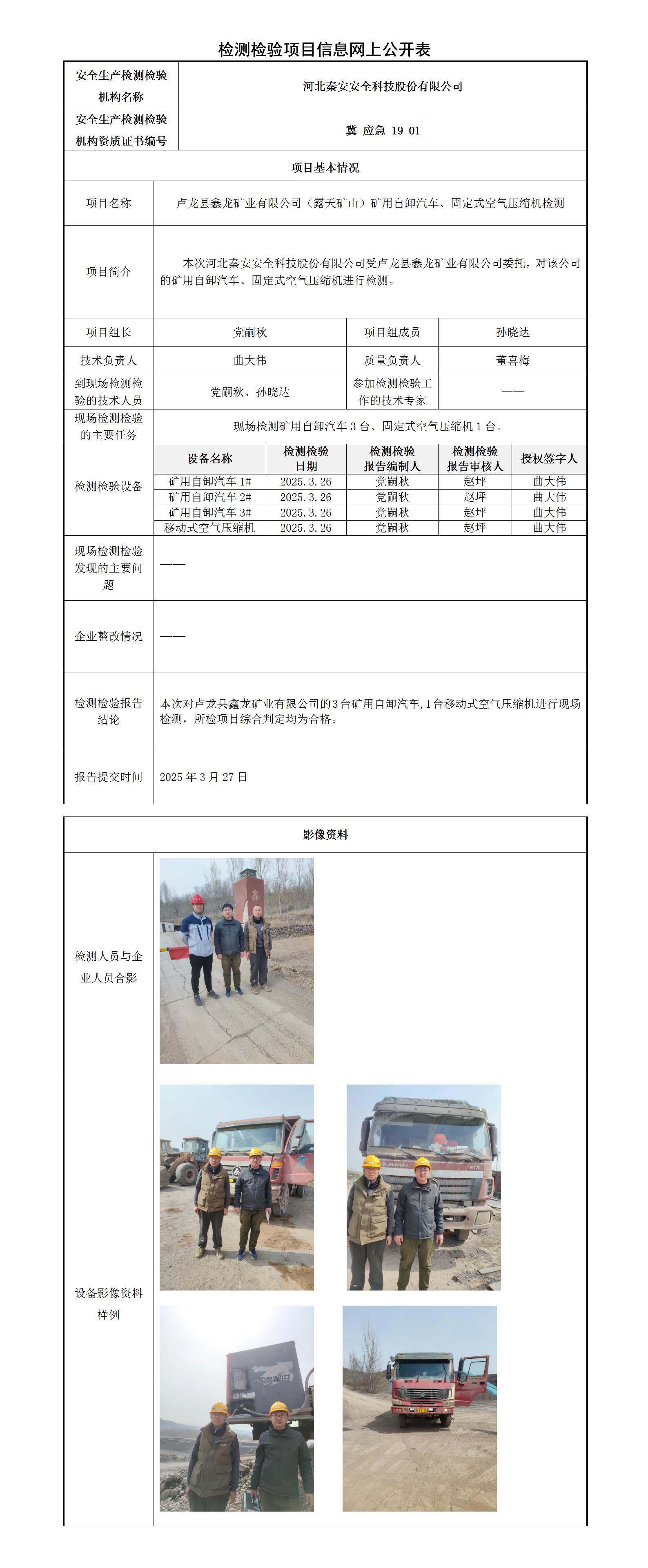 冀秦2025-0B20014 卢龙县鑫龙矿业有限公司-----检测检验信息网上公开表