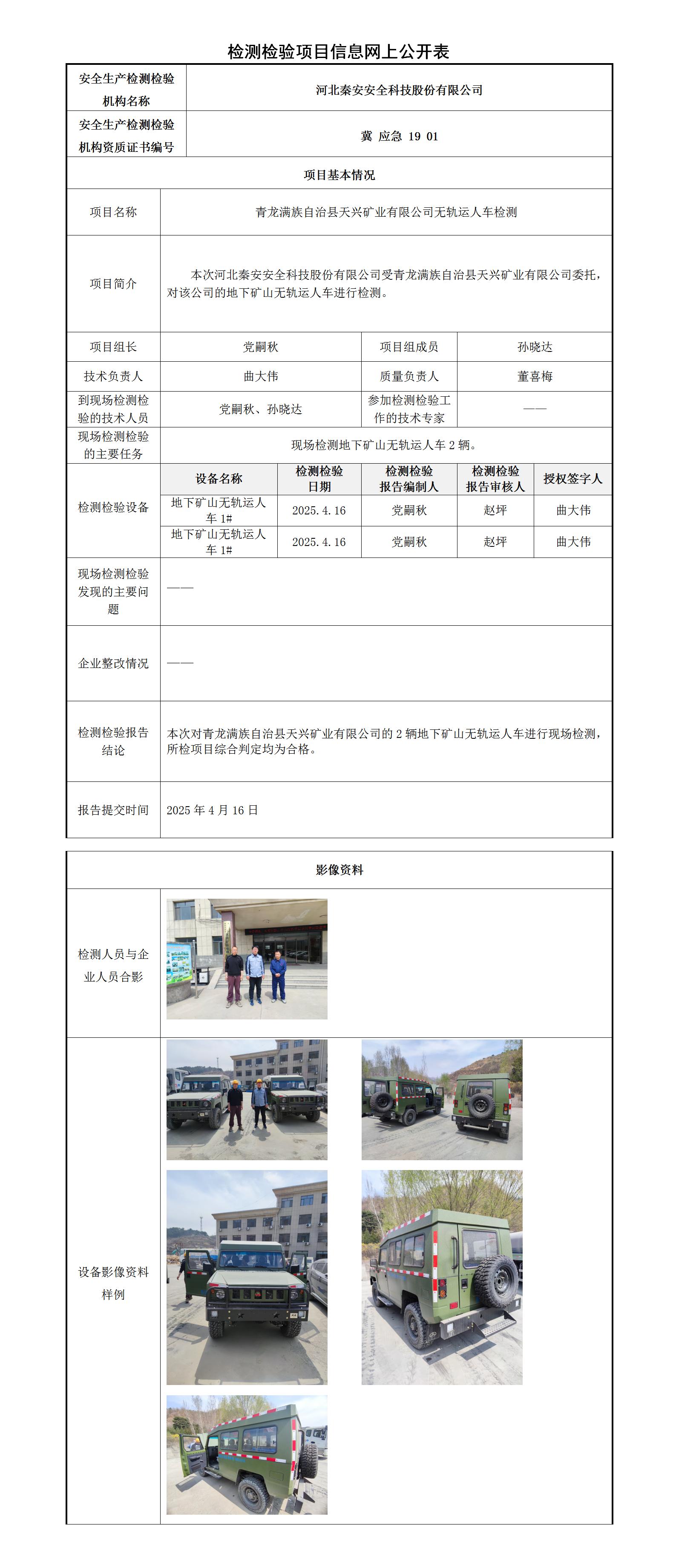 冀秦2025-0B20018 青龙满族自治县天兴矿业有限公司蒲杖子铁矿蒲杖子区段(地下矿山)-----检测检验信息网上公开表