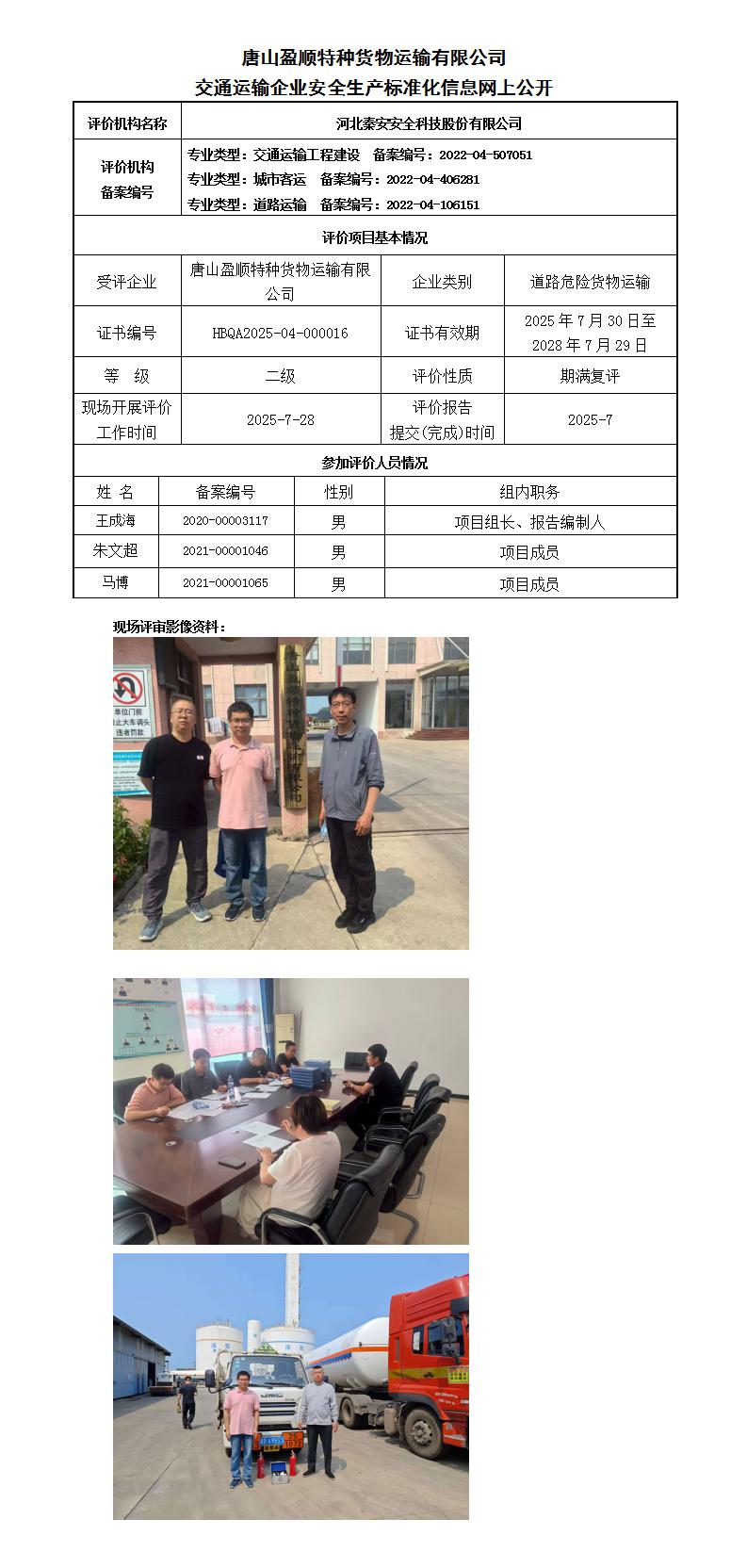 唐山盈顺特种货物运输有限公司-交通运输企业安全生产标准化信息网上公开
