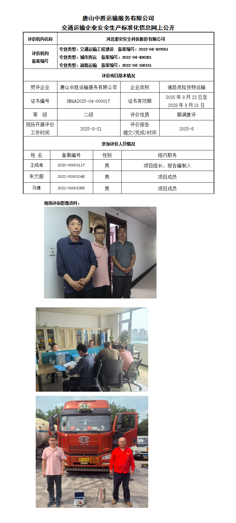 唐山中胜运输服务有限公司交通运输企业安全生产标准化信息网上公开