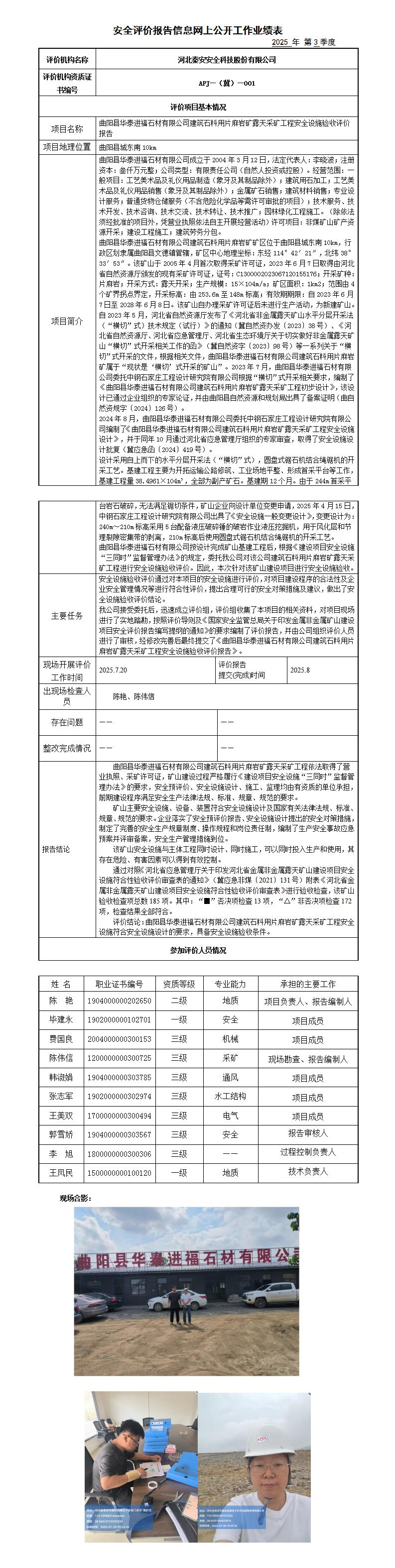 曲阳县华泰进福石材有限公司建筑石料用片麻岩矿露天采矿工程安全设施验收评价报告——信息网上公开工作业绩表