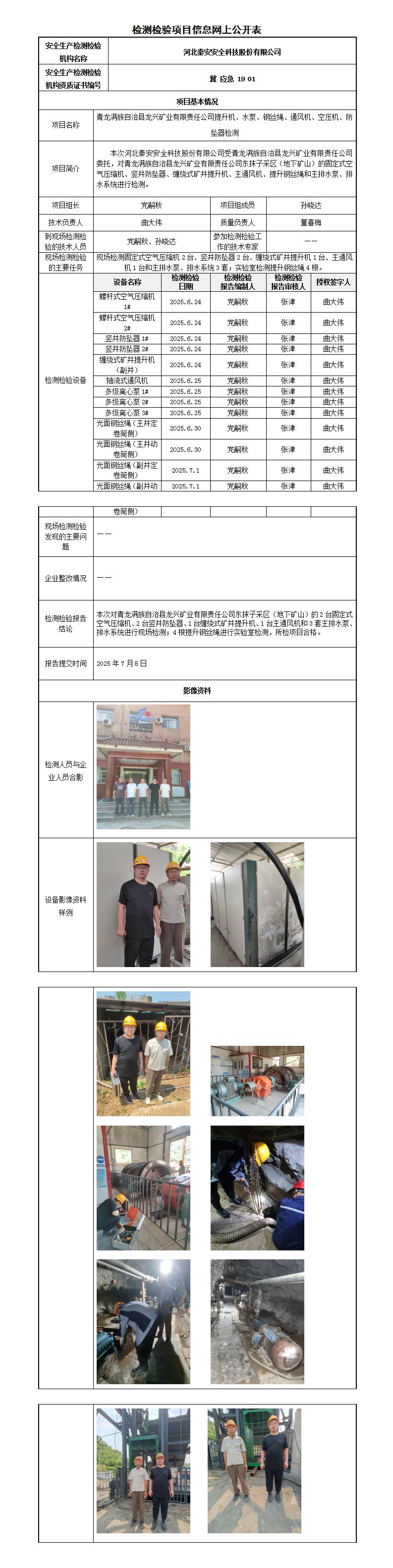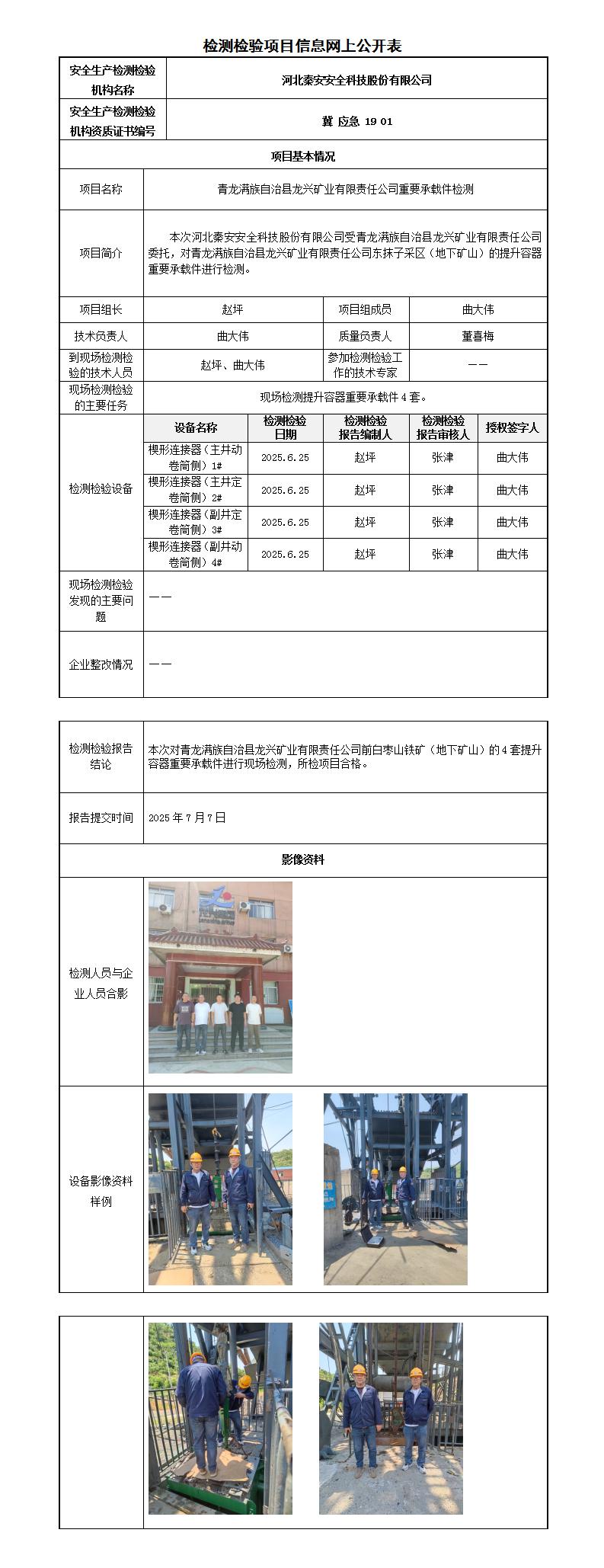 冀秦2025-0B20025 青龙满族自治县龙兴矿业有限责任公司东抹子采区(地下矿山)-----检测检验信息网上公开表