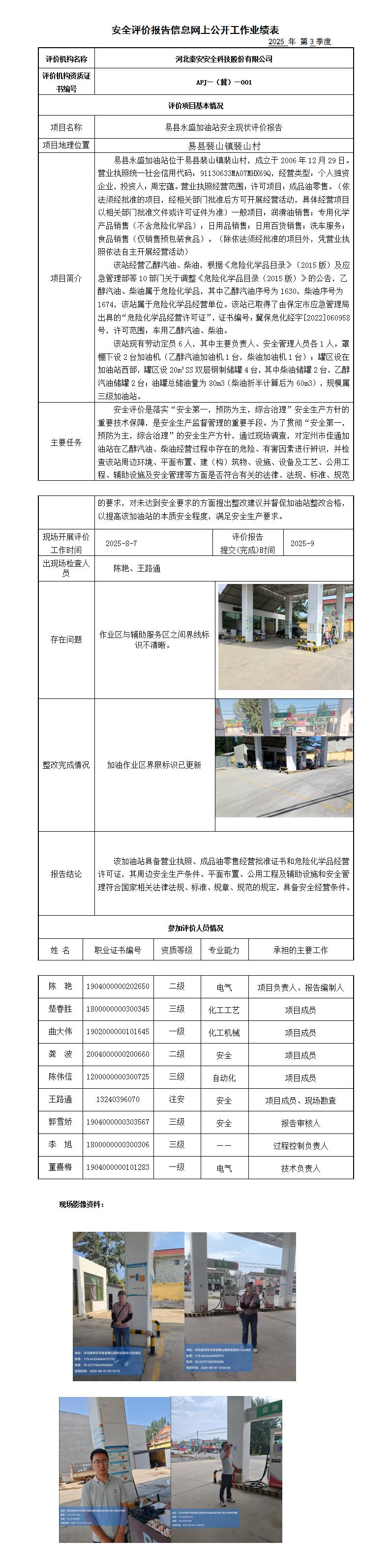 易县永盛加油站安全现状评价报告——信息网上公开工作业绩表