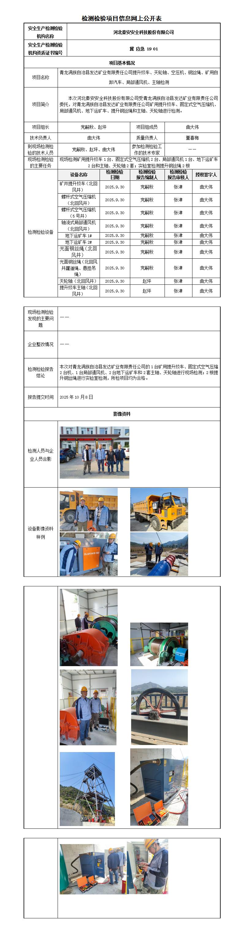 冀秦2025-0B20037 青龙满族自治县发达矿业有限责任公司(地下矿山)-----检测检验信息网上公开表