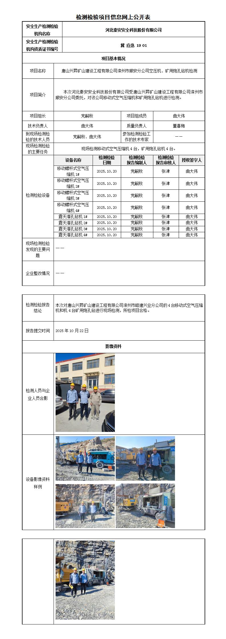 冀秦2025-0B20041 唐山兴昇矿山建设工程有限公司滦州市顺安分公司-----检测检验信息网上公开表