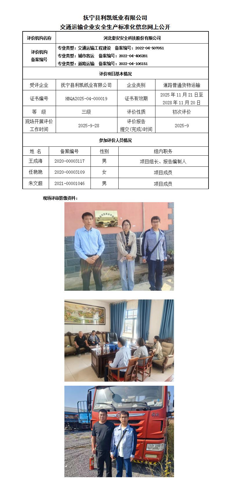 抚宁县利凯纸业有限公司交通运输企业安全生产标准化信息网上公开