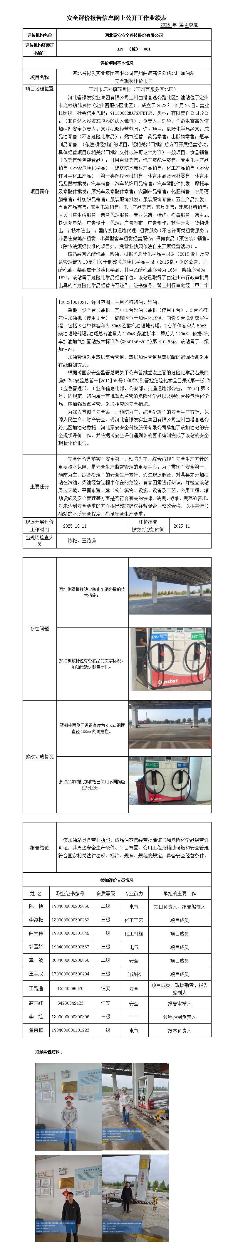 河北省禄发实业集团有限公司定州曲港高速公路北区加油站安全现状评价报告——信息网上公开工作业绩表