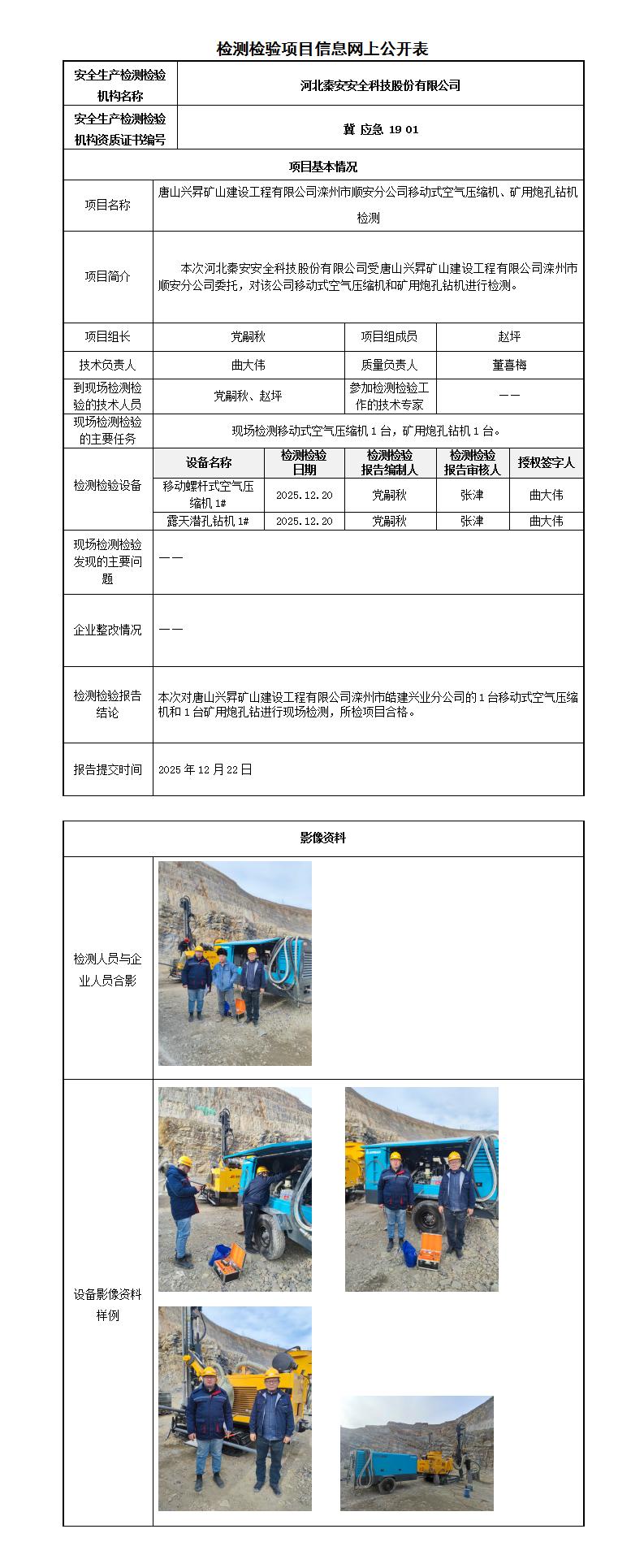 冀秦2025-0B20046 唐山兴昇矿山建设工程有限公司滦州市顺安分公司-----检测检验信息网上公开表
