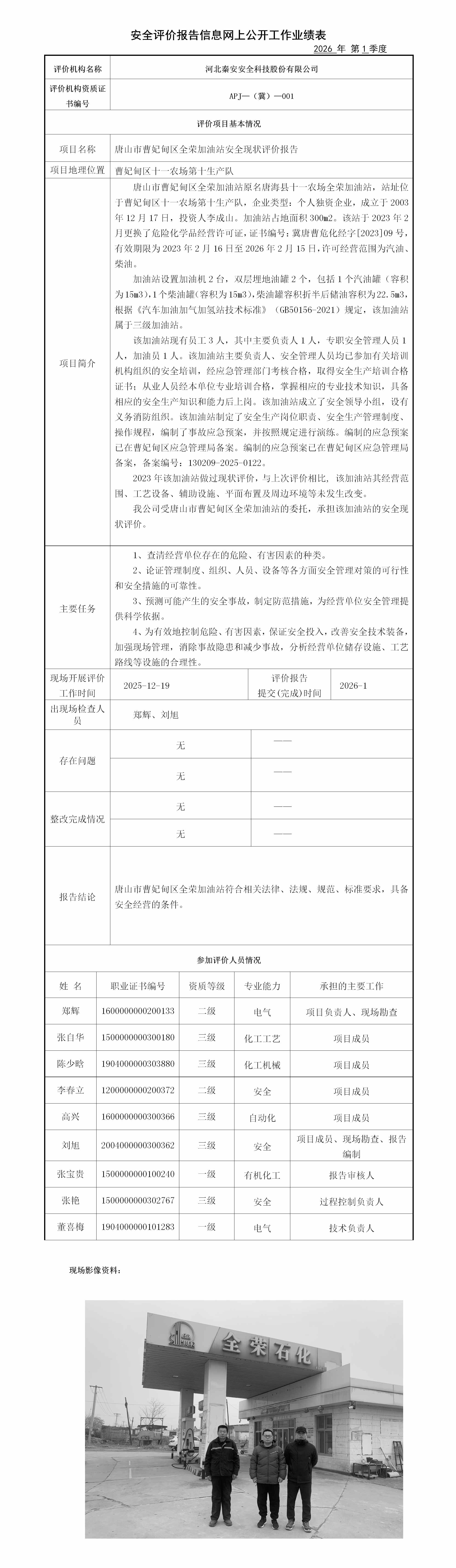 唐山市曹妃甸区全荣加油站安全现状评价报告——信息网上公开工作业绩表