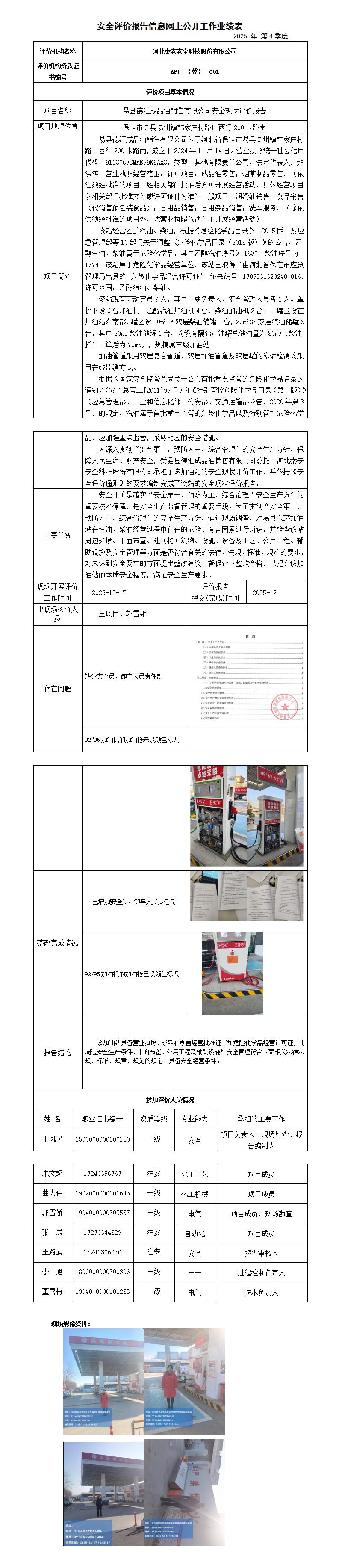 易县德汇成品油销售有限公司安全现状评价报告——信息网上公开工作业绩表