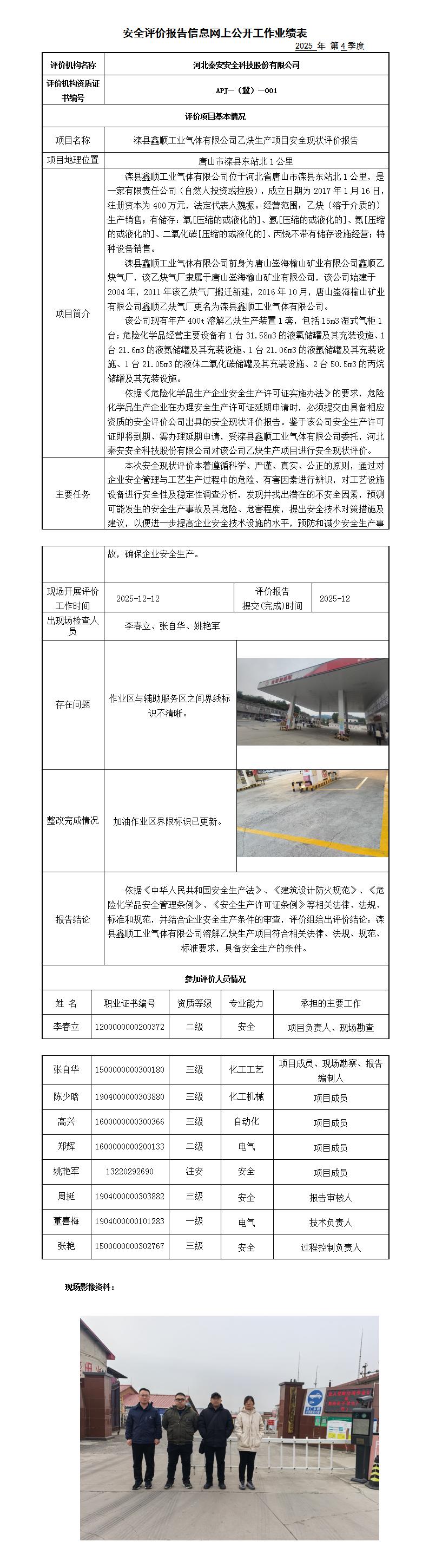 滦县鑫顺工业气体有限公司乙炔生产项目安全现状评价报告——信息网上公开工作业绩表