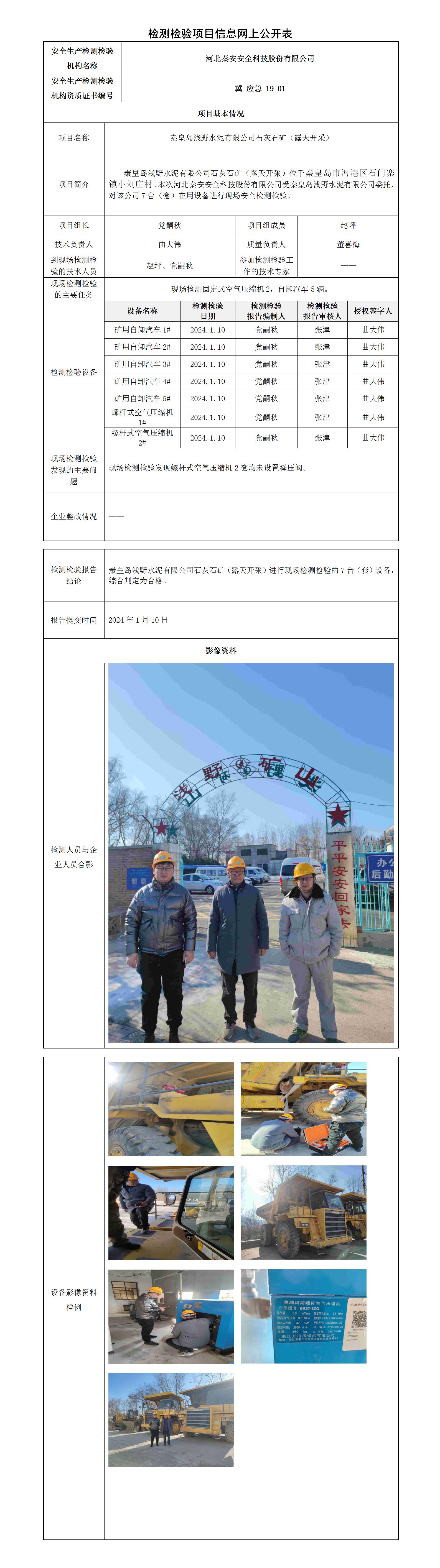 冀秦2024-0B20001秦皇岛浅野水泥有限公司石灰石矿(露天开采)-----检测检验信息网上公开表