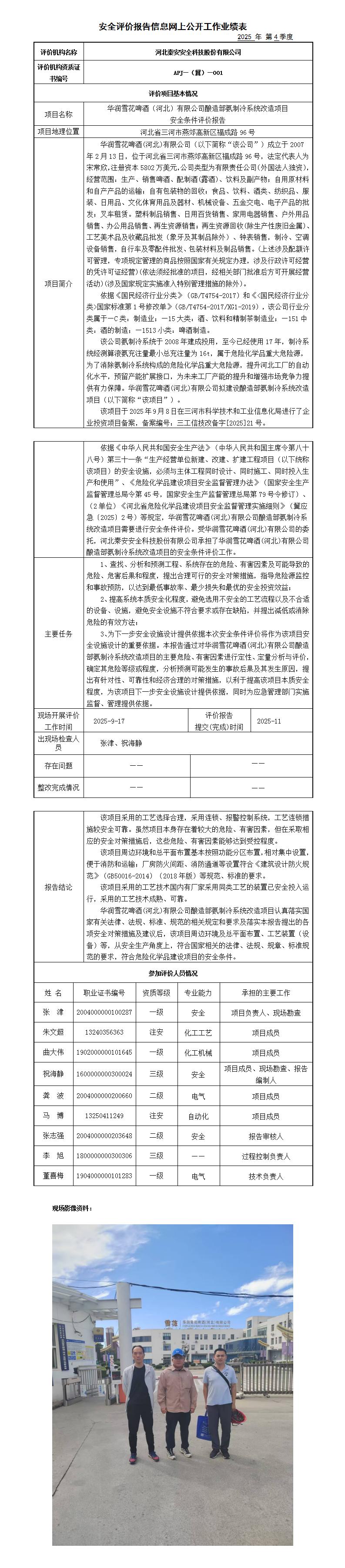华润雪花啤酒(河北)有限公司酿造部氨制冷系统改造项目安全条件评价报告——信息网上公开工作业绩表