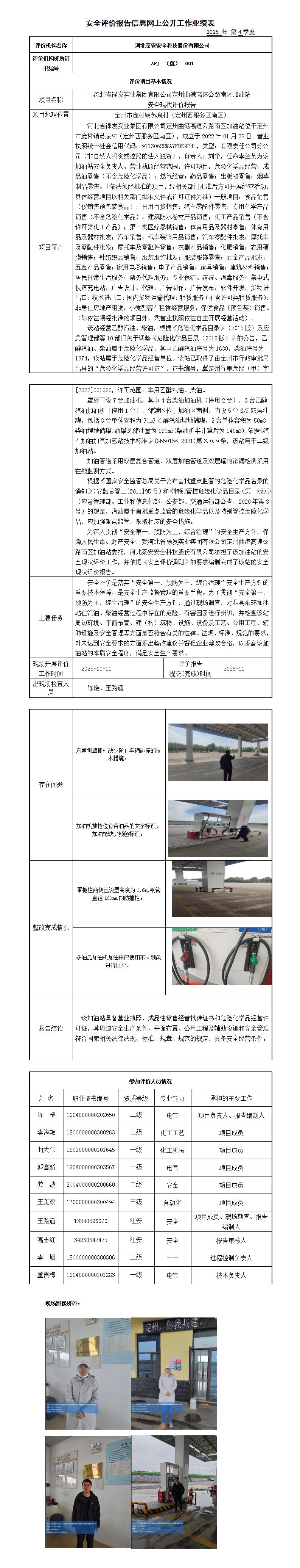 河北省禄发实业集团有限公司定州曲港高速公路南区加油站安全现状评价报告——信息网上公开工作业绩表